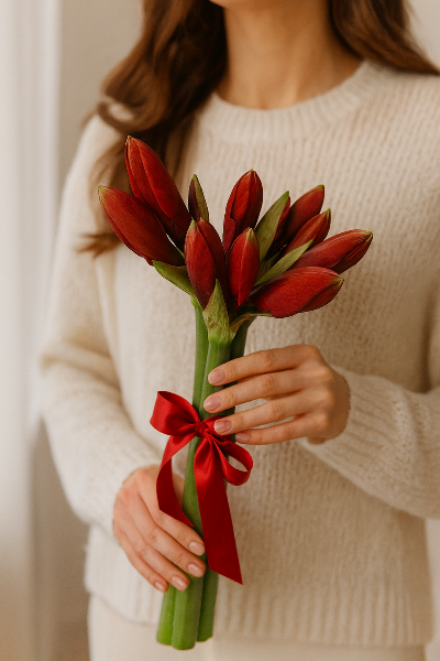 Идеальный выбор для подарка, романтического события или украшения интерьера. Букет красных амариллисов Феррари создаёт атмосферу праздника, стильного уюта и ярких эмоций.