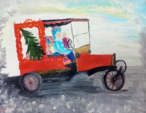 Картина маслом Путешествие за ёлкой-тёплая атмосферная картина, написанная маслом на холсте (40×50 см) 24 ноября 2025 года в музее на автокиновыставке В. Задорожного.